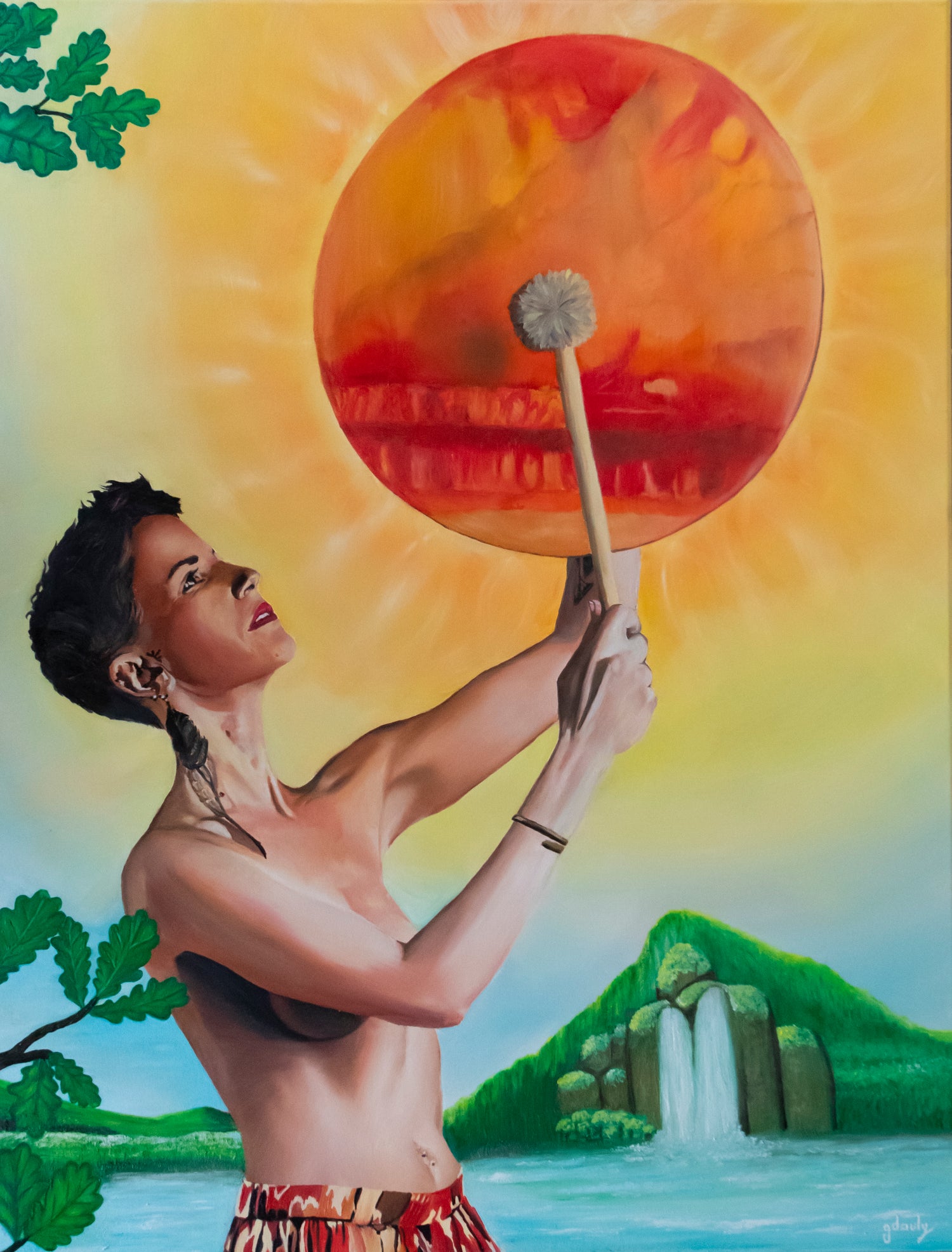 Il s'agit d'une véritable communion entre le modèle et son tambour, qui apporte une puissance symbolique forte, celle de l'union à soi, de la résonance par le biais de la musique, de la vibration de l'instrument.